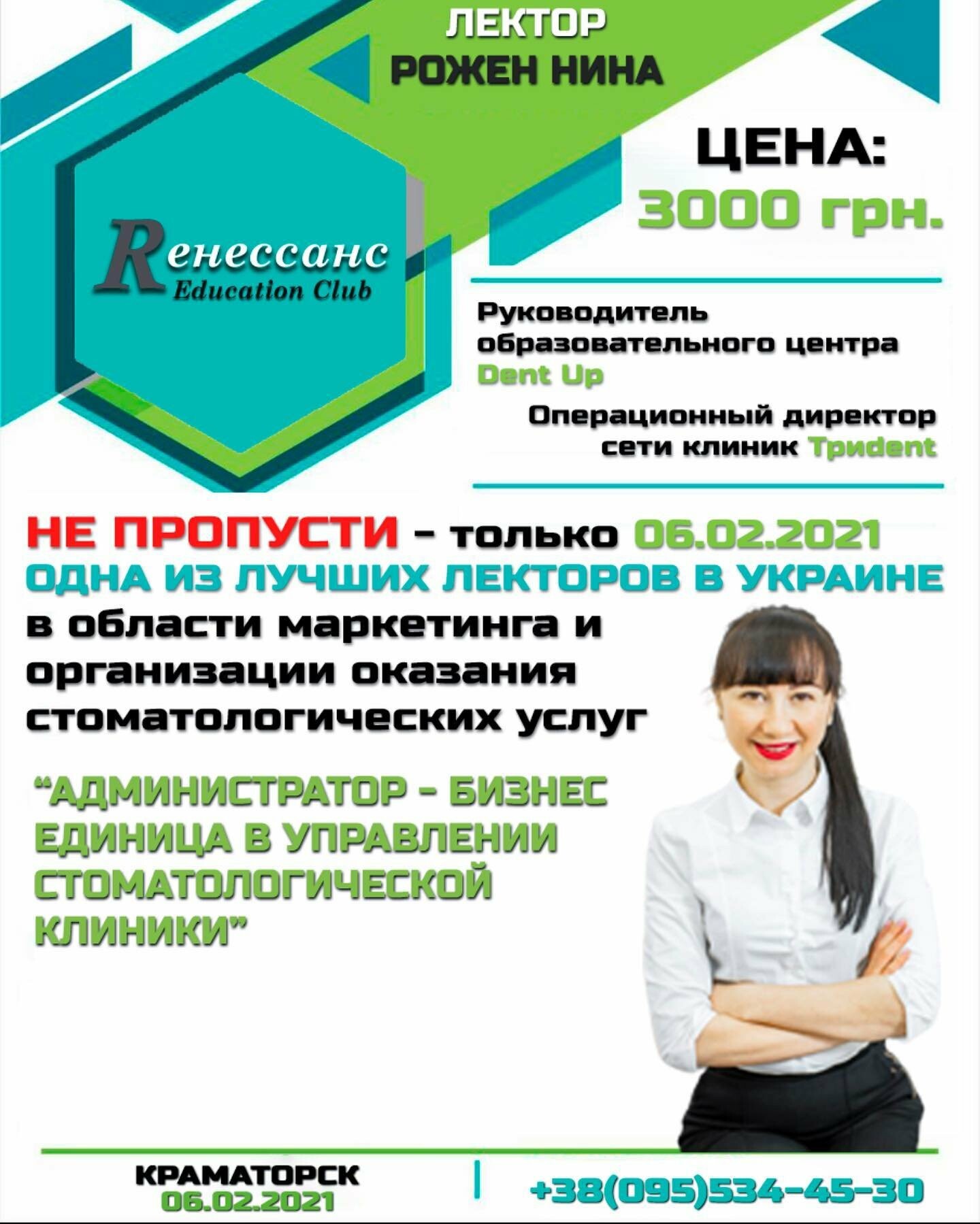 Поэтому 06.02.2021г. в г.Краматорск будет проходить профессиональный тренинг от «Renessans Education Club» на тему: «Администратор – бизнес единица в управлении стоматологической клиники».